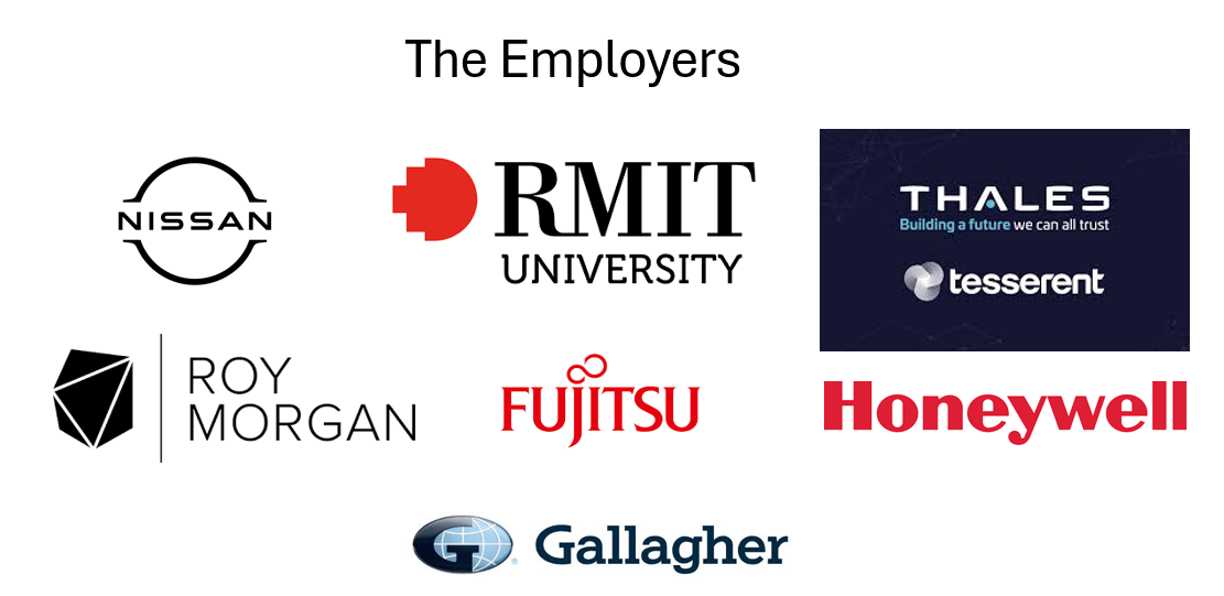 Two placements, two weeks each term, inside leading companies. Recent hosts include Nissan, Thales, RMIT University, Honeywell, Gallagher, Fujitsu, and Roy Morgan.
